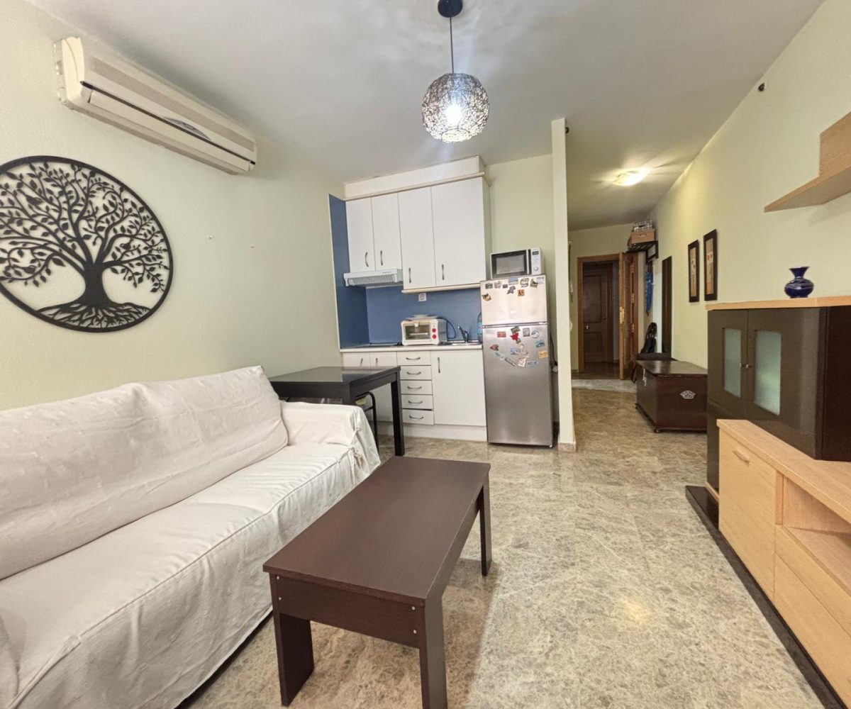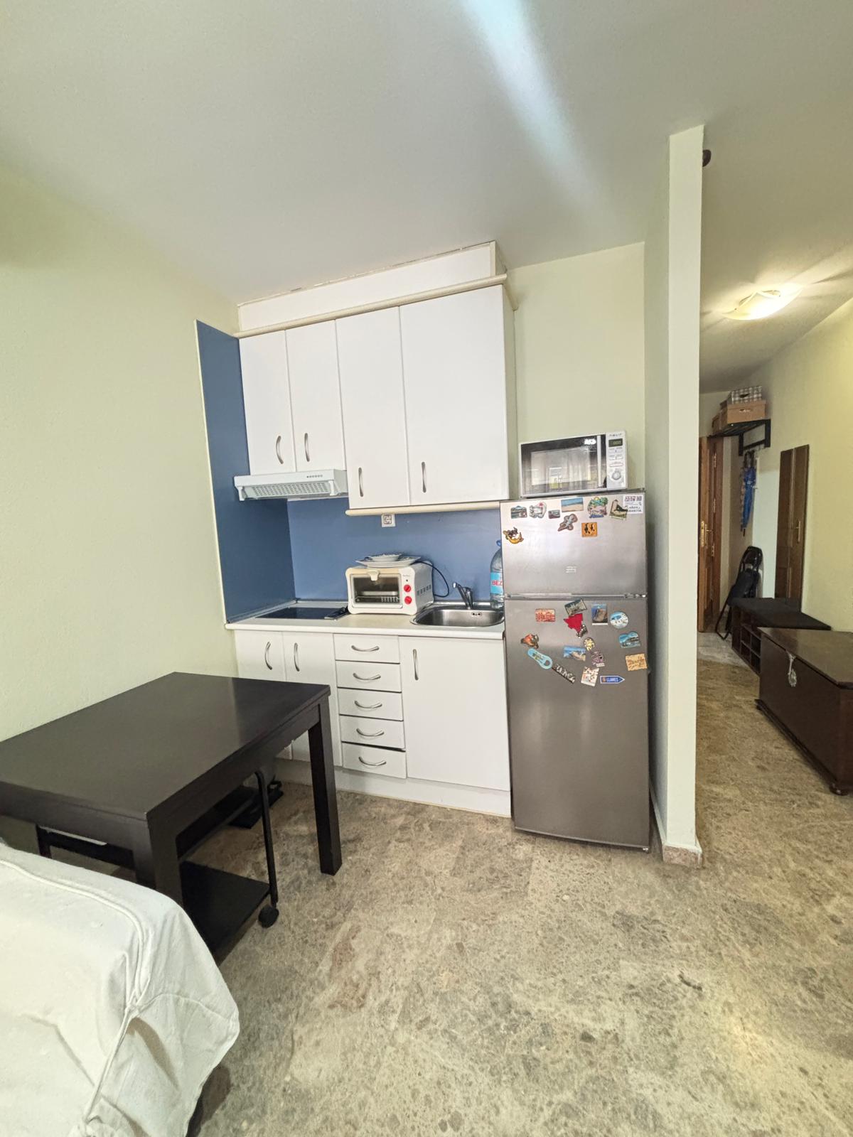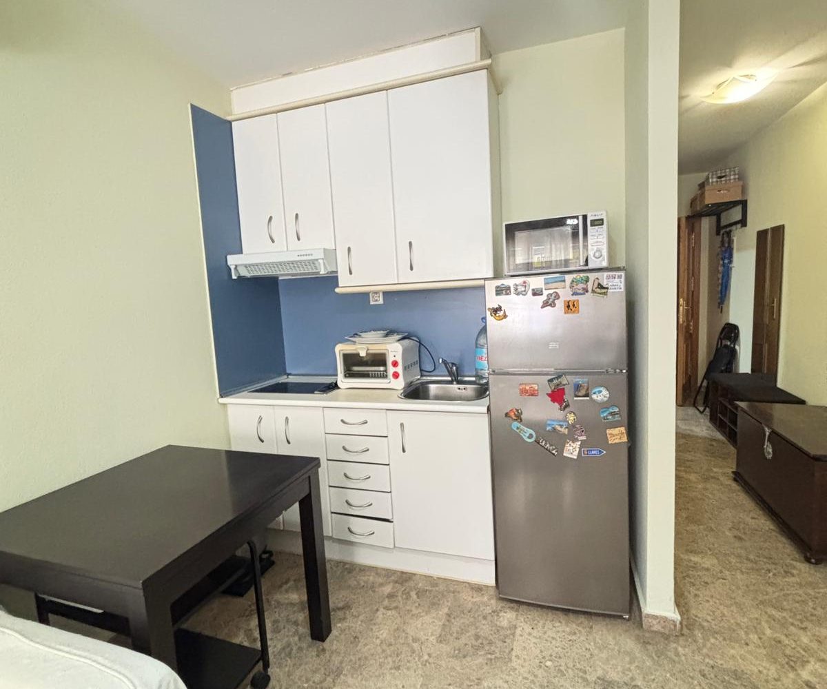 Dispone de un baño completo con ducha y una cocina totalmente equipada, todo ello en un espacio funcional y bien aprovechado. Los suelos de mármol aportan un toque elegante y de calidad, mientras que el gran armario empotrado a medida ofrece una excelente capacidad de almacenaje.