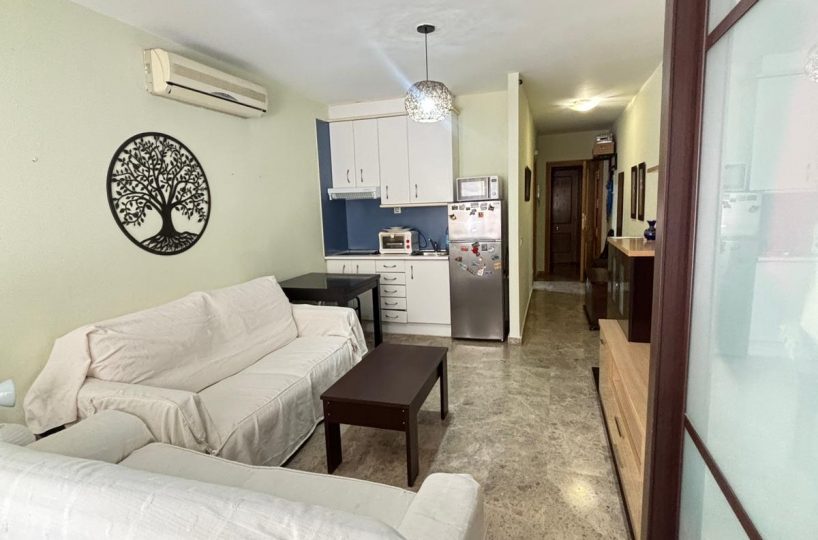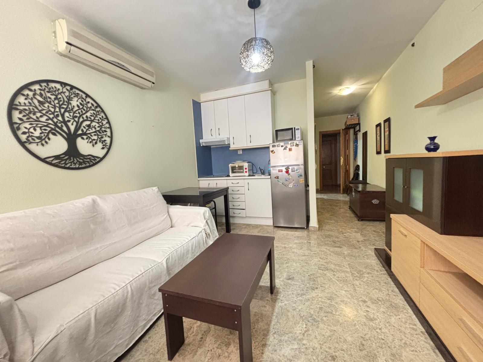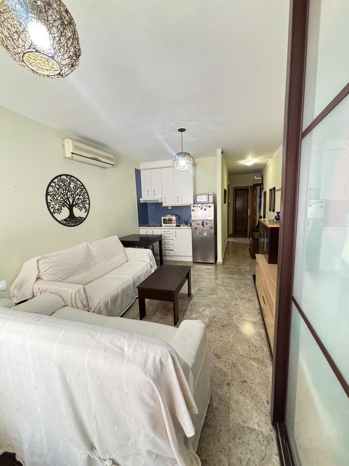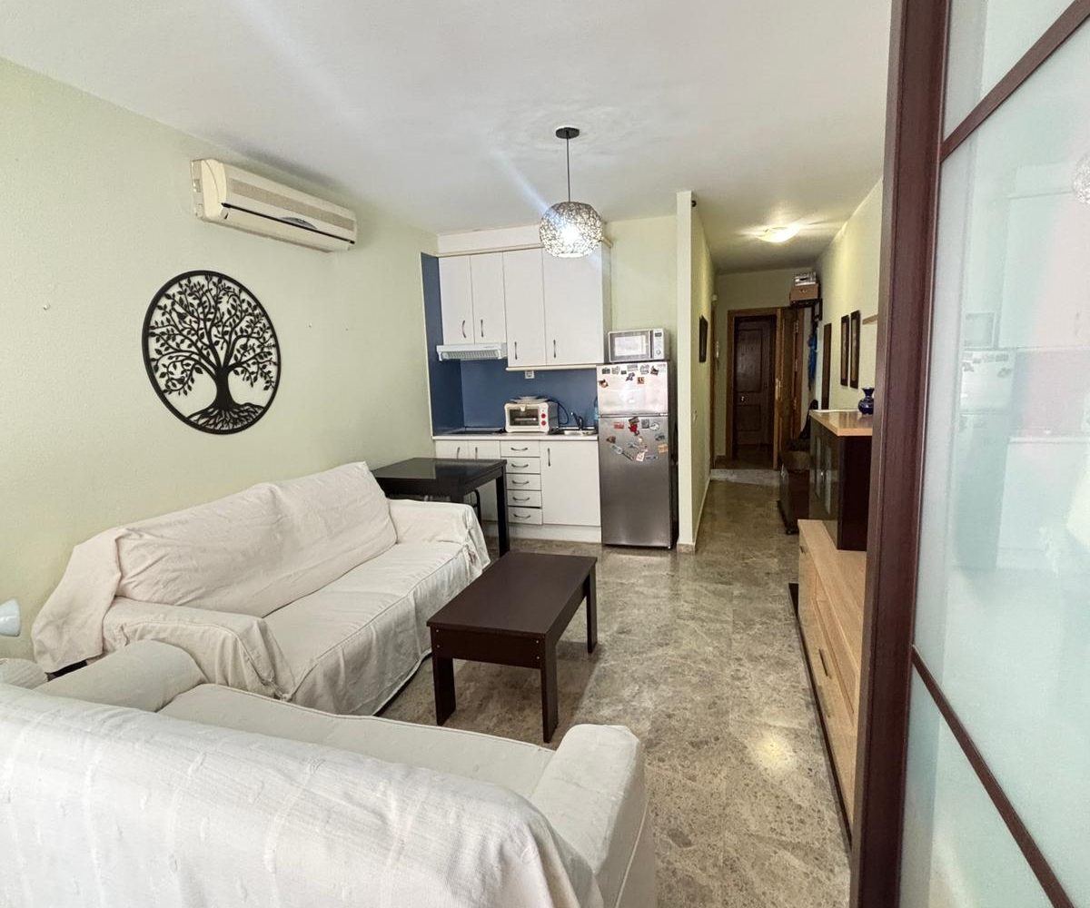 Dispone de un baño completo con ducha y una cocina totalmente equipada, todo ello en un espacio funcional y bien aprovechado. Los suelos de mármol aportan un toque elegante y de calidad, mientras que el gran armario empotrado a medida ofrece una excelente capacidad de almacenaje.