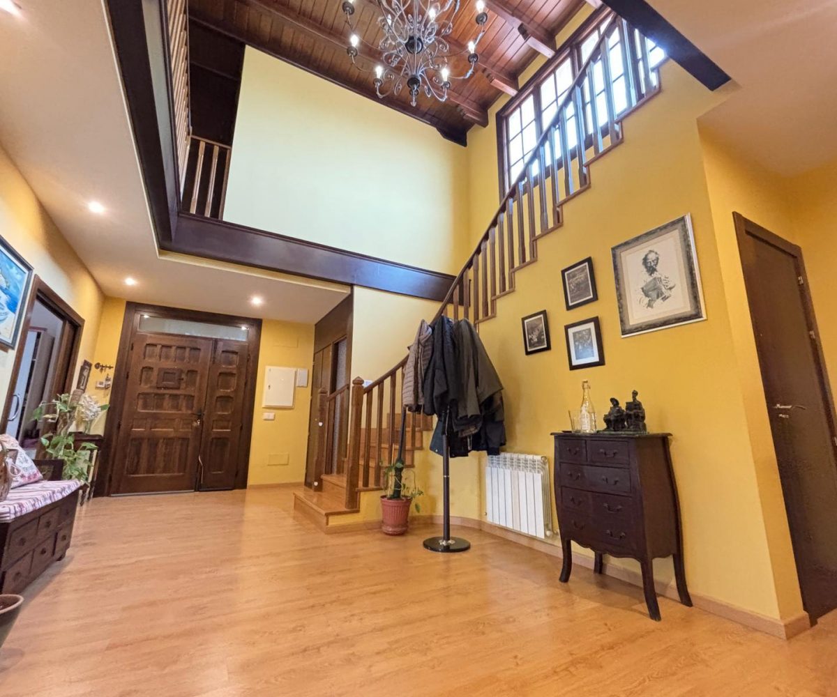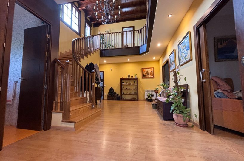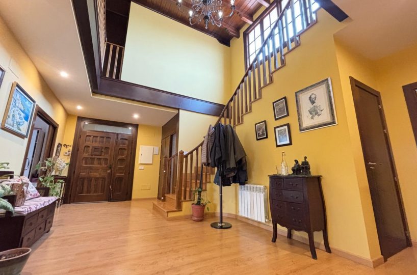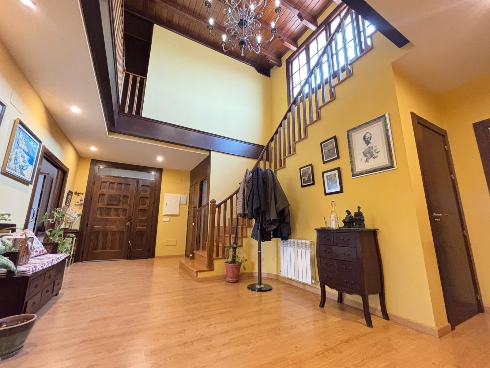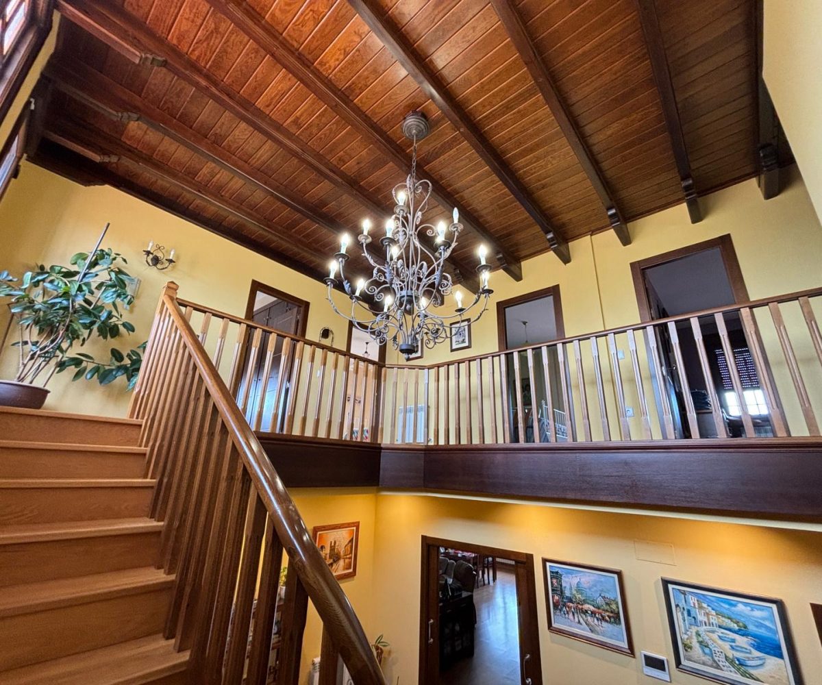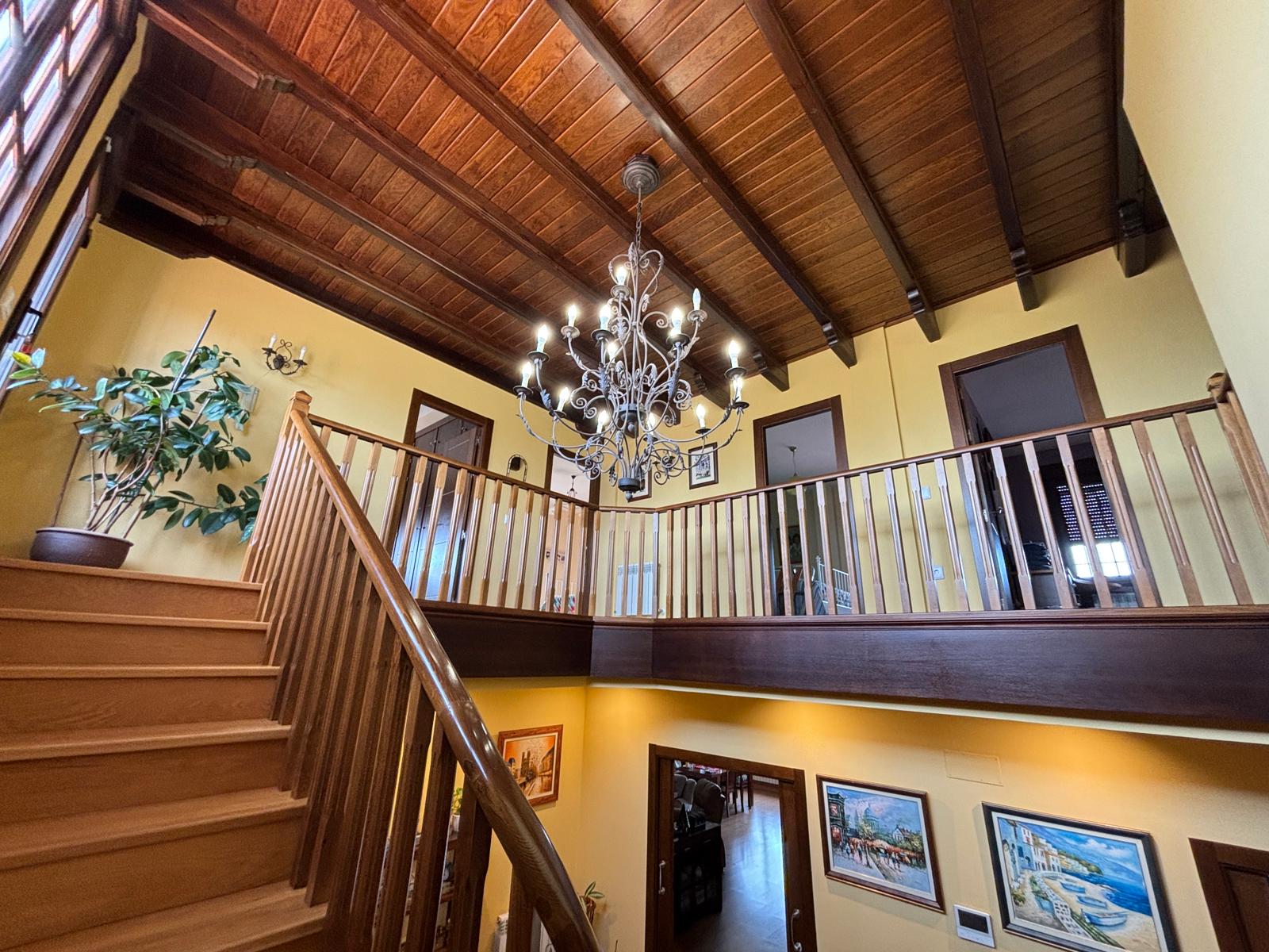 Desde el primer paso, la vivienda impresiona: un hall central y artesonado de madera que transmite elegancia, personalidad y exclusividad.