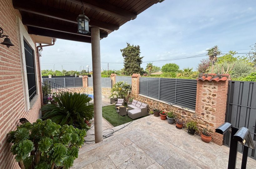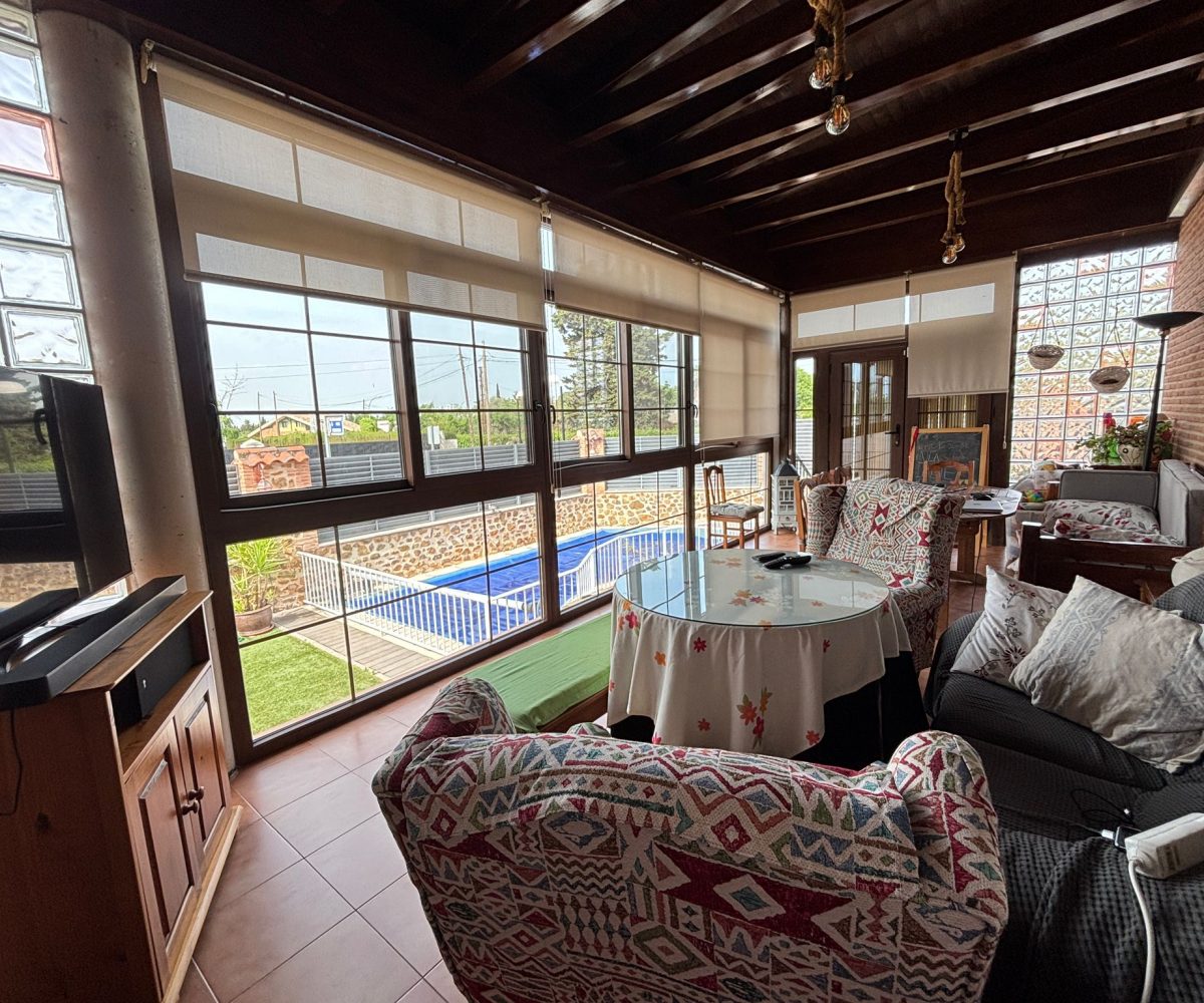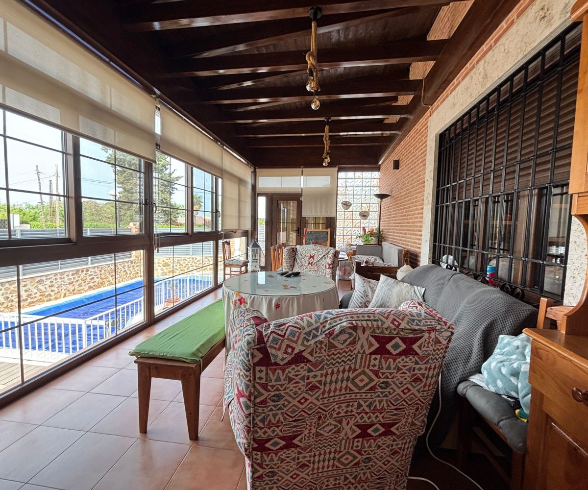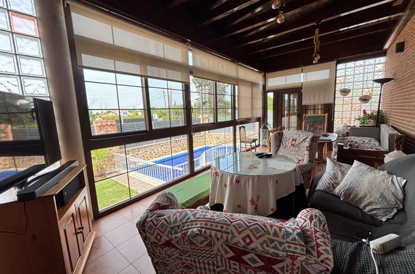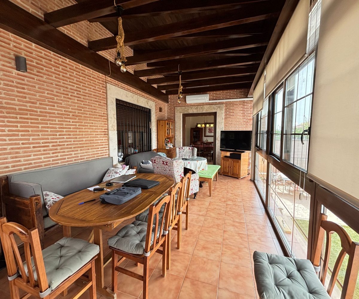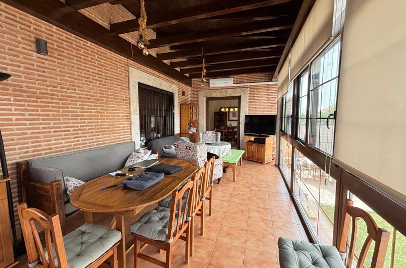 🌿 PORCHE ACRISTALADO DE 40 m² con artesonado de madera: un espacio diferencial para disfrutar todo el año, tanto en invierno como en verano.